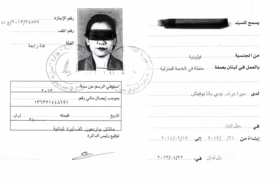 Ayres Jasper, 21, Maryland County; Came to Lebanon Jan.17, 2013. She worked for one year and seven months without a salary (250). Boss abused her sexually with videotaping activities.
