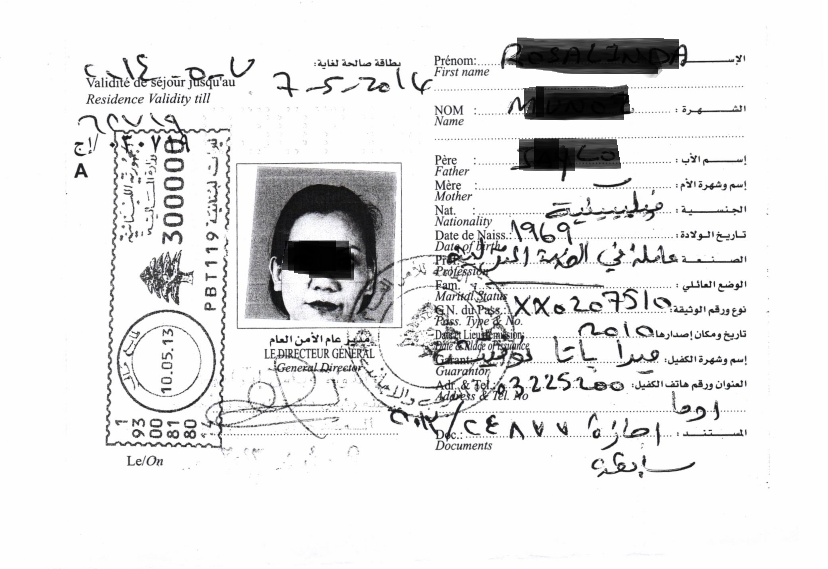 Rema Nyepan, 25, from Maryland County; arrived in Beirut August 17, 2013. Worked 1 year and 5 months without salary 250 that was promised her, she was beaten in the eyes when she asked for the salary.